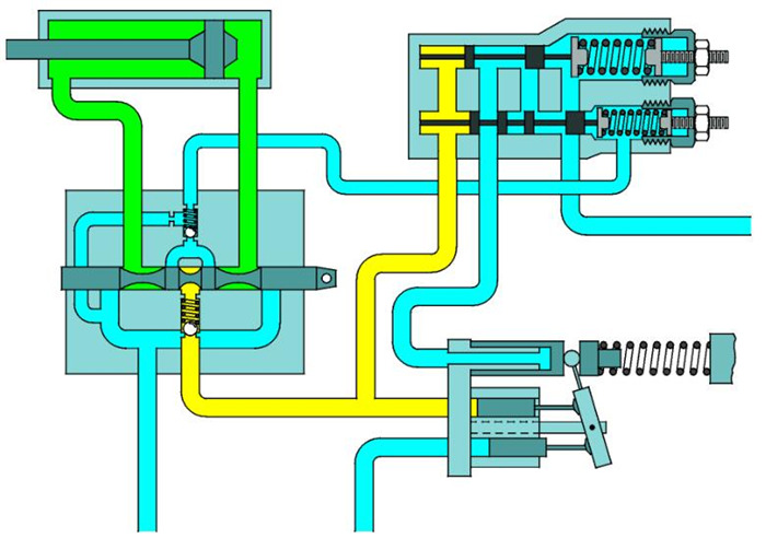 當液壓系統(tǒng)未工作,處于待機狀態(tài)時,控制閥必須切斷作動油缸(或馬達)與液壓泵之間的壓力信號。這將在系統(tǒng)未工作時導致液壓泵自動轉入低壓等待狀態(tài)。當控制閥工作時,先從作動油缸(或馬達)得到壓力需求,并將壓力信號傳遞給液壓泵,使泵開始對系統(tǒng)壓力做出響應。系統(tǒng)所需的流量是由滑閥的開度控制的。系統(tǒng)的流量需求通過信號道、控制閥反饋給液壓泵。這種負載感應式柱塞泵與負載敏感控制閥的組合使整個液壓系統(tǒng)具有根據(jù)載荷情況提供作需壓力-流量的特性,此即負載敏感系統(tǒng)的基本功能。